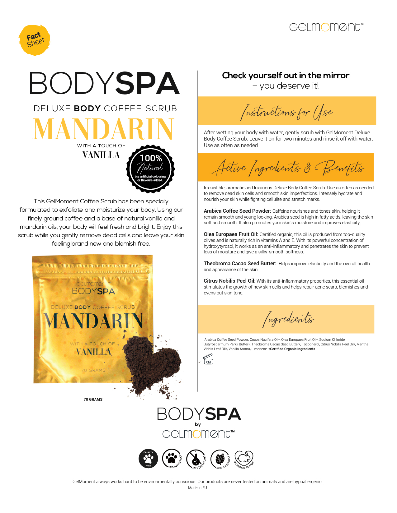 A refreshing blend of natural vanilla and mandarin oils, this Deluxe Body Coffee Scrub will have you ready to take on the day!